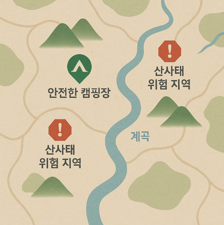 ▲ 안전한 캠핑장 위치를 표시한 가상의 지도. 계곡과 산사태 위험 지역을 피해 표시되어 있습니다.